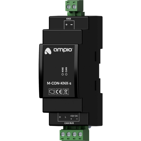 Moduł M-CON-KNX-s jest elementem systemu Ampio. Do zasilania modułu wymagane jest napięcie 11 — 16V DC. Jego sterowanie odbywa się poprzez magistralę CAN.